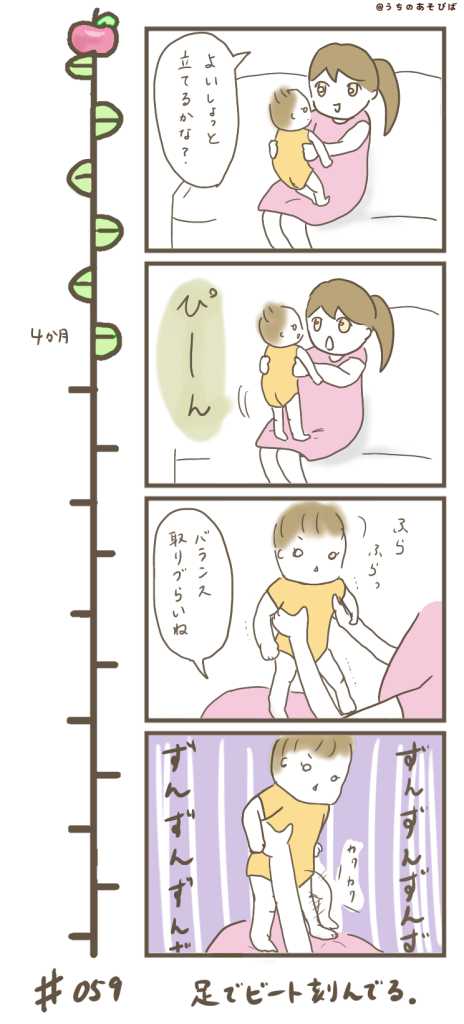私が最初にこの動きを見たのは、生後4ヶ月頃。 抱っこしていて、なんとなく足裏が手に当たったので床に触れさせてみたら……スッと足を突っ張る姿勢に。